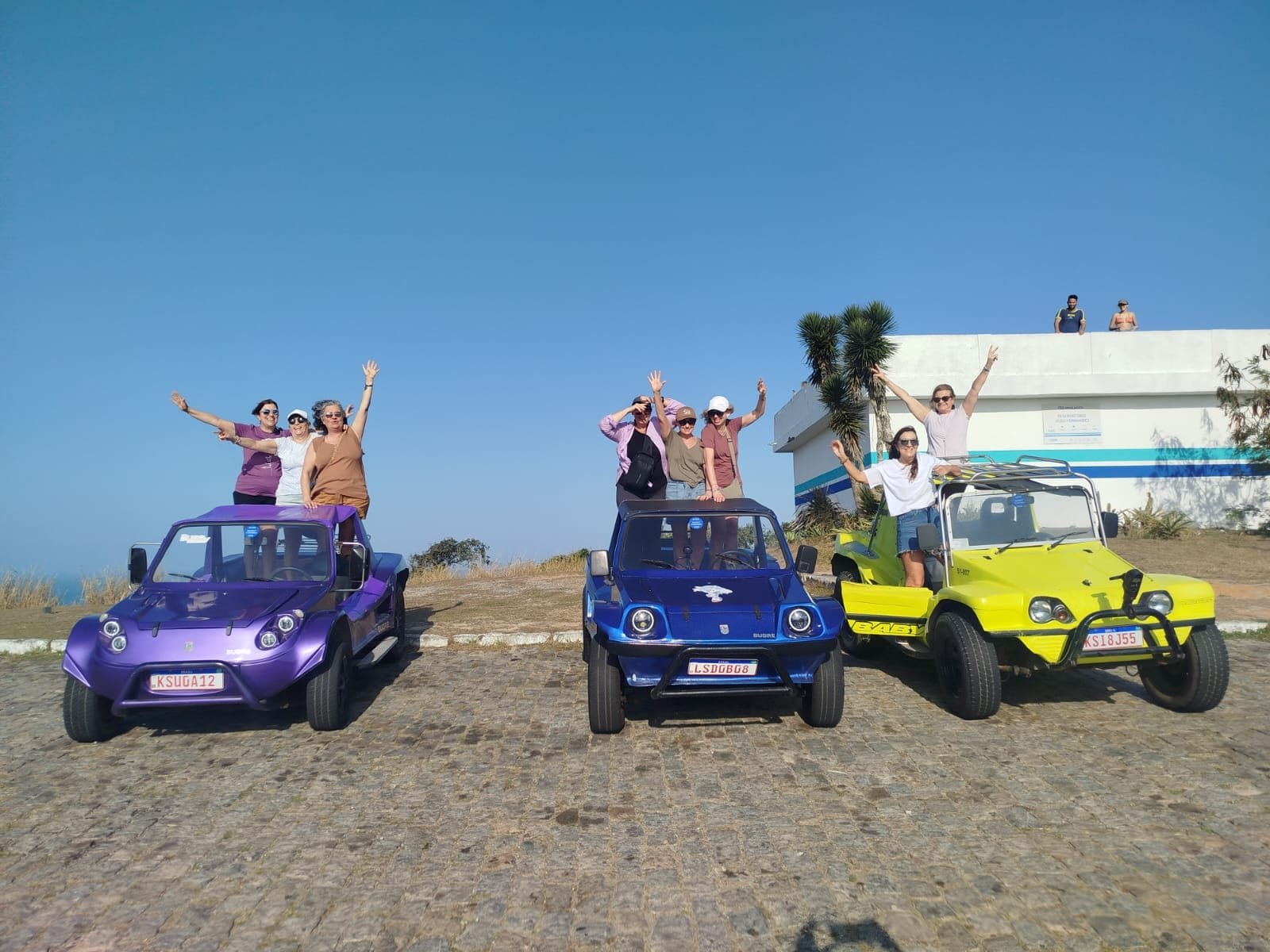 Turistas aproveitando um passeio de buggy em Búzios com a Búzios Trip Tour, com vista para o mar.